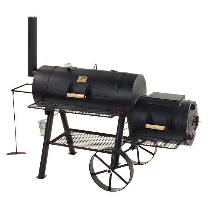 Der Barbeque Smoker Texas Classic von Joe’s Barbeque Smoker ist ein besonders stabiler Grill mit massiven Eisenrädern, der echtes Barbeque-Feeling nach Hause bringt. Der Smoker in rustikaler Optik überzeugt durch viele praktische Details wie etwa einer besonders großen Grillfläche, drei Ablageflächen, einer massiven Feuerbox aus Stabeisen, einer Kochplatte auf dem Feuerboxdeckel oder einem Bimetallthermometer an der Garkammer, sodass hervorragende Grillergebnisse und einzigartige Geschmackserlebnisse besonders leicht erzielt werden. Dank seiner 5 mm starken Stahlblech-Wandung hält der Smoker die Hitze besonders lang.